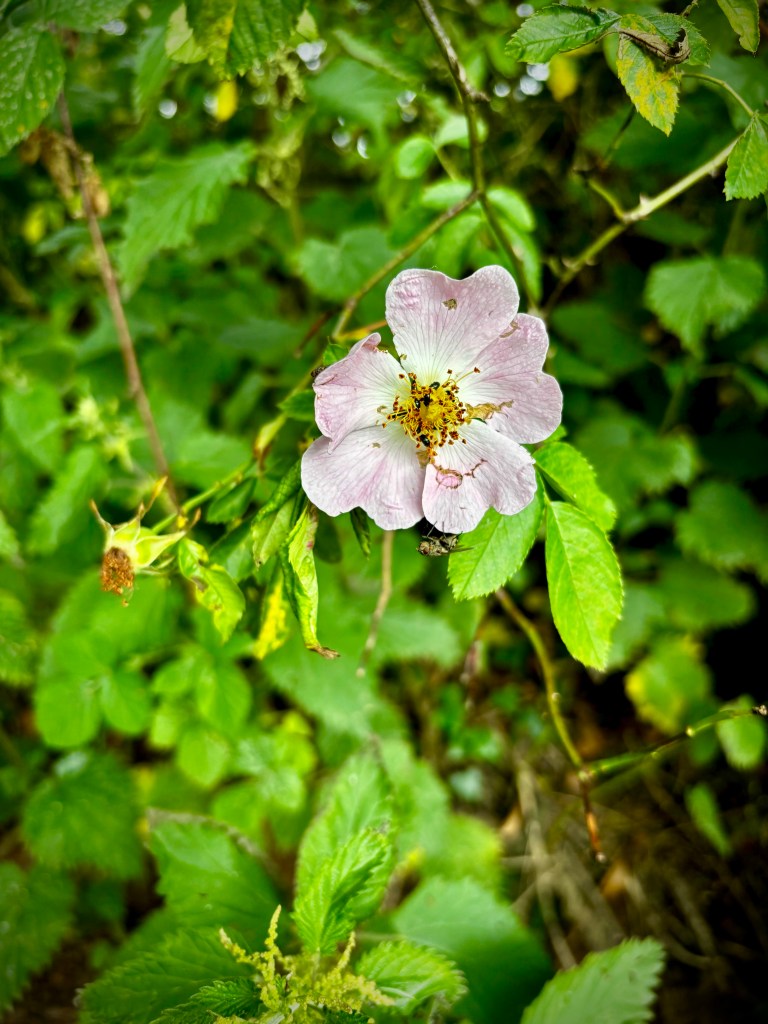 Brambles. Later in the summer the flowers will become blackberries.Dog rose