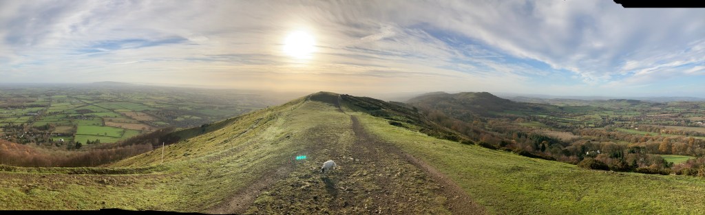 The photo on the homepage, and above, is of a place I return to time and again. From there, the land falls away on either side, revealing a patchwork of pleasant fields and hedgerows — Herefordshire and Wales to the west, Worcestershire to the east, and, on a clear day, the view extends as far as the Cotswolds and Oxfordshire.