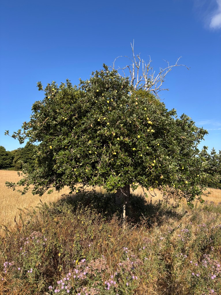 Alone on the highest point of the land is an old crab apple tree. These days, the fruit is usually devoured by birds and insects before I get chance to take anything from it and its aged branches are weighted more with mistletoe than apples – though this year I might be lucky. The trunk is almost completely hollow and a recent investigation by an ecologist found it to be home to bats.