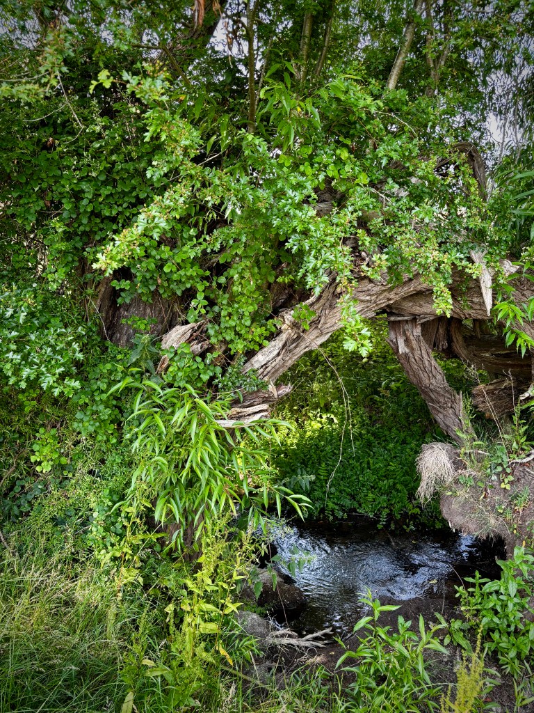 The brook is lined mainly with Salix (Willow) of one sort or another. These fast-growing moisture-loving trees become shape-shifters in their decline, slowly bending and twisting and splitting as they gradually return to the ground. Having resisted the temptation to take the chainsaw to some of these, they now provide a more interesting visual and are, arguably, better for the environment.